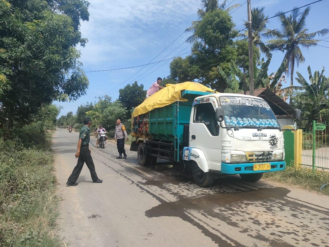 Selain itu, Bhabinkamtibmas bersama Babinsa memberikan sosialisi sekaligus mengingatkan jika selama mengangkut material agar bak truk ditutupi terpal.